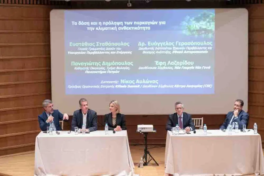 Μεταξύ των ομιλητών, ο Υπουργός Κλιματικής Κρίσης & Πολιτικής Προστασίας, Βασίλης Κικίλιας αναφέρθηκε στην ένταση των πυρκαγιών που έπληξαν τη χώρα πρόσφατα, λέγοντας χαρακτηριστικά ότι «σύμφωνα με το σύστημα engaged, το ψηφιοποιημένο επιστημονικό εργαλείο, βρισκόμαστε 14% κάτω από το μέσο όρο των καμένων εκτάσεων των τελευταίων 20 χρόνων στη χρονιά την οποία είχαμε τα χειρότερα δεδομένα των τελευταίων ετών.»