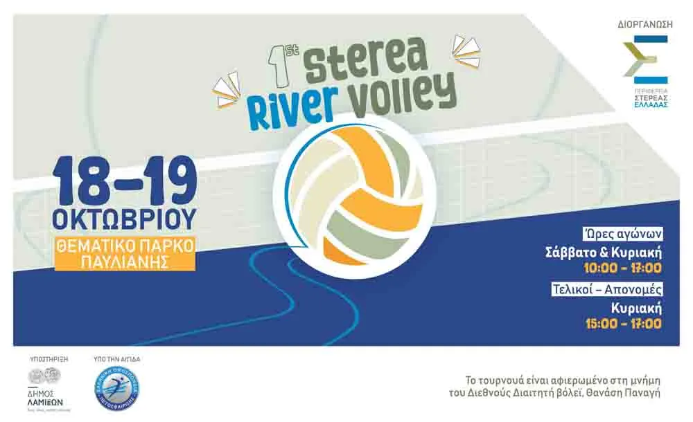 Η Περιφέρεια Στερεάς Ελλάδας ανακοινώνει τη διεξαγωγή διήμερου Περιφερειακού τουρνουά μικτών αγώνων βόλεϊ με την ονομασία: «1ο STEREA RIVER VOLLEY», υπό την αιγίδα της Ελληνικής Ομοσπονδίας Πετοσφαίρισης και με την υποστήριξη του Δήμου Λαμιέων.