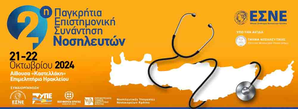 Μετά την επιτυχημένη 1η Παγκρήτια Επιστημονική Συνάντηση Νοσηλευτών, το Περιφερειακό Τμήμα Κρήτης του Εθνικού Συνδέσμου Νοσηλευτών Ελλάδας (ΕΣΝΕ), σε συνεργασία με την Περιφέρεια Κρήτης, την 7η Υγειονομική Περιφέρεια, τις Διευθύνσεις των Νοσηλευτικών Υπηρεσιών των Νοσοκομείων και Μονάδων Πρωτοβάθμιας Φροντίδας Υγείας της Κρήτης, συνδιοργανώνουν και σας προσκαλούν στη 2η Παγκρήτια Επιστημονική Συνάντηση Νοσηλευτών που θα διεξαχθεί στις 21-22 Οκτωβρίου στο Επιμελητήριο Ηρακλείου, υπό την αιγίδα του Τμήματος Νοσηλευτικής του Ελληνικού Μεσογειακού Πανεπιστημίου.