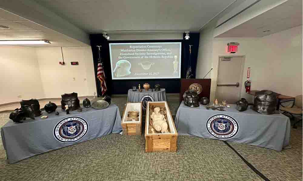 Τριάντα αρχαιότητες επιστρέφουν στην Ελλάδα μετά την κατάσχεσή τους από την Εισαγγελία του Μανχάταν. Οι αρχαιότητες παραδόθηκαν στις ελληνικές Αρχές την Παρασκευή 15 Δεκεμβρίου από τον επικεφαλής της Antiquities Trafficking Unit Matthew Bogdanos Αντιεισαγγελέα στην Εισαγγελία του Μανχάταν, σε ειδική τελετή που πραγματοποιήθηκε στα γραφεία της Εισαγγελίας, παρουσία του Γενικού Γραμματέα Πολιτισμού Γεωργίου Διδασκάλου, του Γενικού Προξένου της Ελλάδας στη Νέα Υόρκη Κωνσταντίνου Κωνσταντίνου και στελεχών της Διεύθυνσης Τεκμηρίωσης και Προστασίας Πολιτιστικών Αγαθών.
