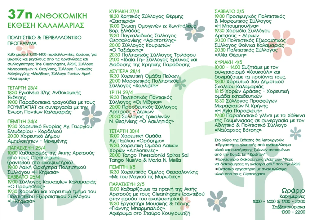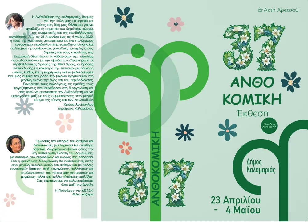 Με μεγάλη χαρά και αίσθημα ευθύνης απέναντι στον τόπο, την ιστορία του και σεβασμό στο περιβάλλον (θάλασσα, παραλία, φύση), ανοίγουμε και φέτος την 37η Ανθοκομική Έκθεση Καλαμαριάς, ανανεώνοντας την αισθητική και τον προσανατολισμό της, σε μια προσπάθεια αναβάθμισης του ιστορικού αυτού θεσμού.