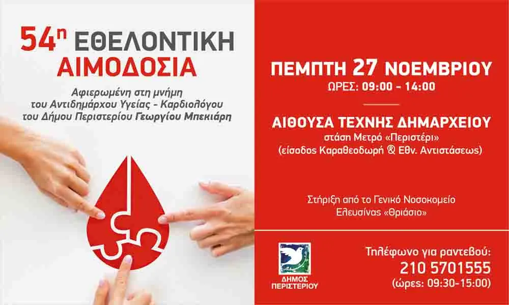 Ο Δήμος Περιστερίου διοργανώνει την 54η Εθελοντική Αιμοδοσία, την Πέμπτη 27 Νοεμβρίου 2025, ώρες 09:00 – 14:00, στην Αίθουσα Τέχνης του Δημαρχιακού Μεγάρου (στάση Μετρό «Περιστέρι», είσοδος Καραθεοδωρή & Εθν. Αντιστάσεως), με τη στήριξη του Γενικού Νοσοκομείου Ελευσίνας “Θριάσιο”.
