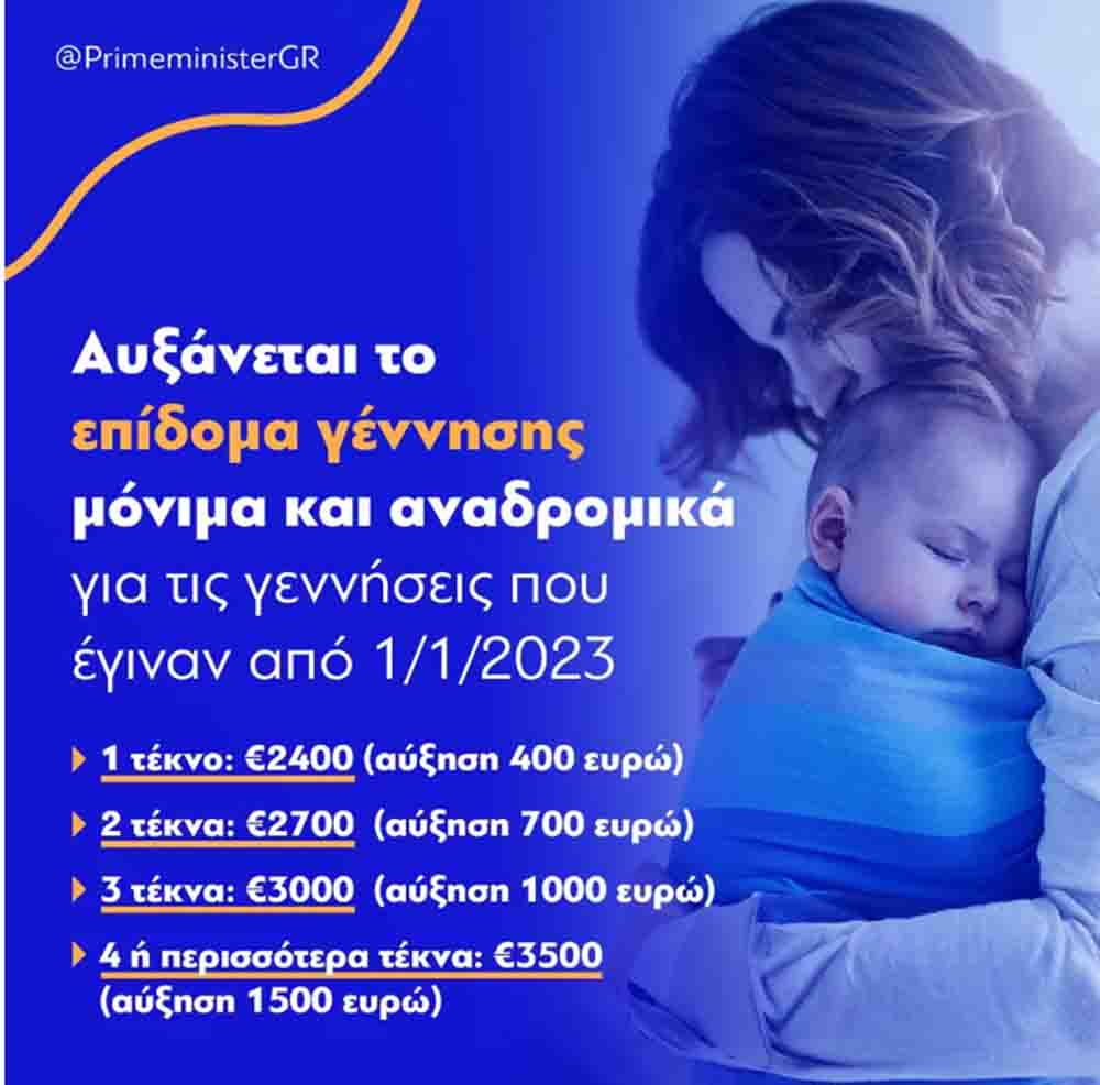 Όπως αναφέρεται σε κοινή ανακοίνωση των δύο υπουργείων, «η εισαγόμενη πληθωριστική κρίση επιβάλλει τη λήψη πρόσθετων πρωτοβουλιών για τη στήριξη των νέων γονέων. Έτσι, η Κυβέρνηση προχωρά στην αναδρομική και μόνιμη αύξηση του επιδόματος γέννησης, που το επιπλέον δημοσιονομικό κόστος για την αύξησή του θα καλυφθεί από την εξοικονόμηση 100 εκατ. ευρώ από επιδόματα που λάμβαναν μέχρι πρότινος οι ελεύθεροι επαγγελματίες που δήλωναν πολύ χαμηλά εισοδήματα».