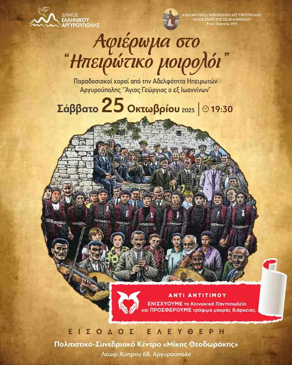 Την εκδήλωση θα ολοκληρώσει το χορευτικό τμήμα της Αδελφότητας Ηπειρωτών Αργυρούπολης, παρουσιάζοντας παραδοσιακούς χορούς από την Ήπειρο, σε ένα γνήσιο λαογραφικό ταξίδι στις ρίζες και τα ήθη του τόπου.