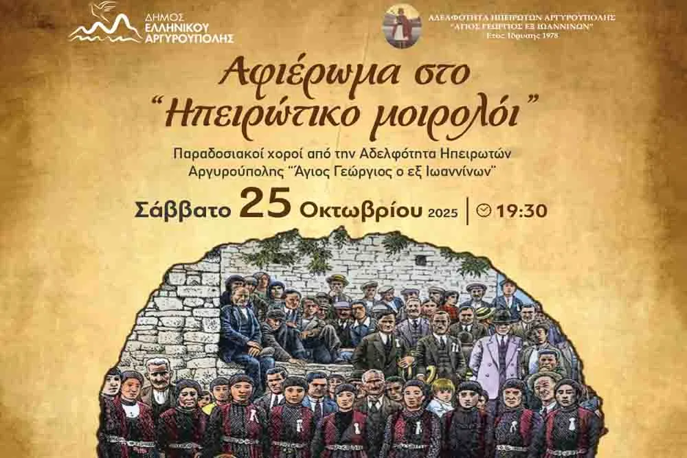 O Δήμος Ελληνικού – Αργυρούπολης σε συνεργασία με την Αδελφότητα Ηπειρωτών Αργυρούπολης «Άγιος Γεώργιος ο εξ Ιωαννίνων», παρουσιάζουν μια ξεχωριστή εκδήλωση αφιερωμένη στο «Ηπειρώτικο Μοιρολόι», το Σάββατο 25 Οκτωβρίου και ώρα 19:30, στο Πολιτιστικό – Συνεδριακό Κέντρο «Μίκης Θεοδωράκης» (Λ. Κύπρου 68, Αργυρούπολη).