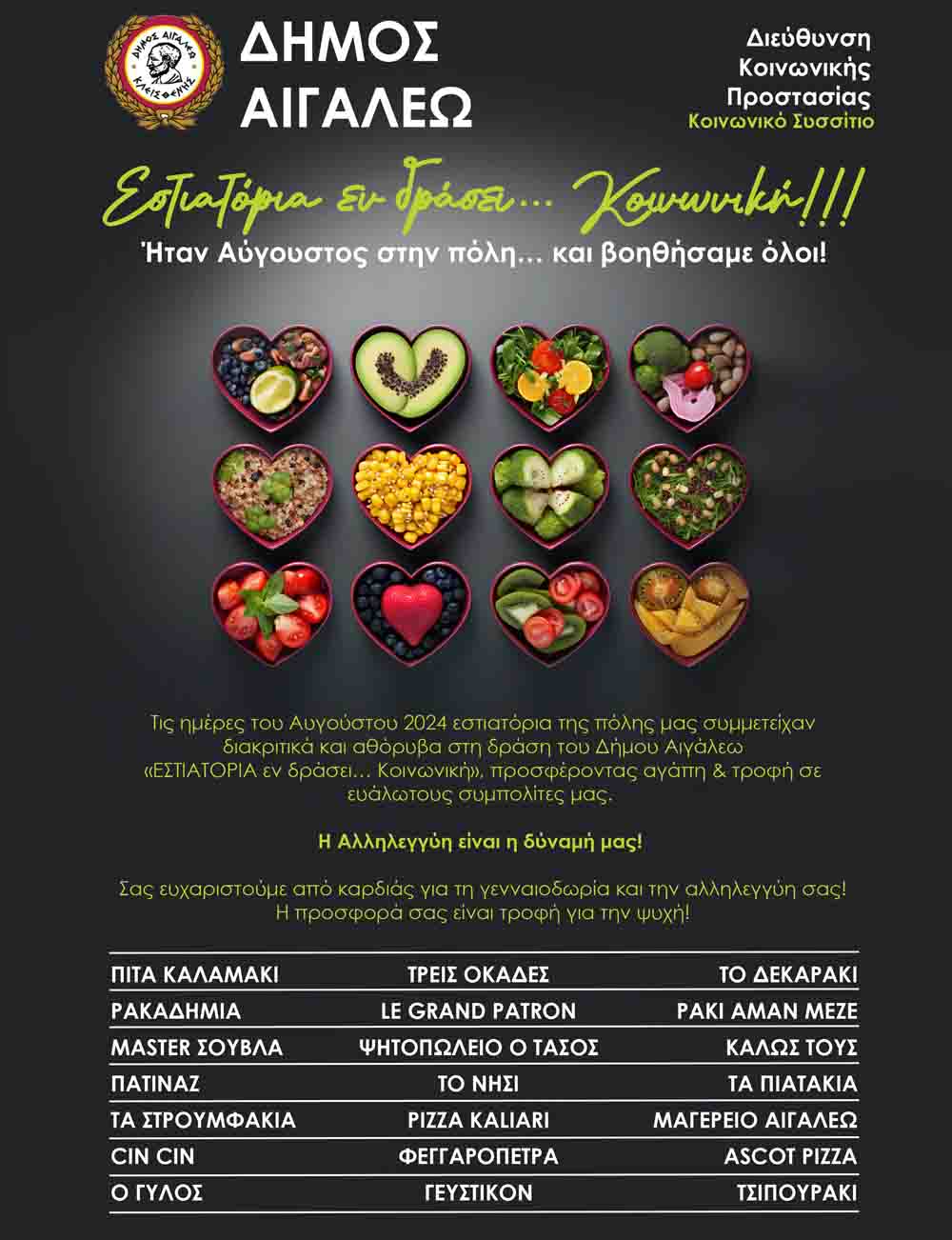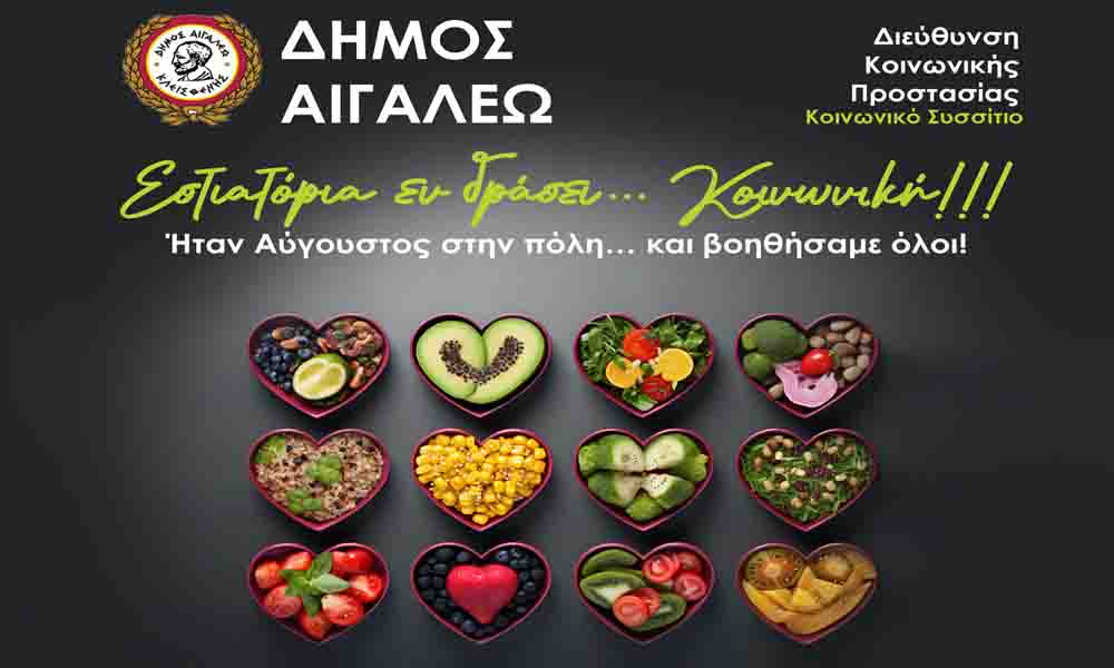 Τον Αύγουστο 2024, καταστήματα και επιχειρήσεις εστίασης της πόλης μας, υποστήριξαν και βοήθησαν έμπρακτα τη δράση «ΕΣΤΙΑΤΟΡΙΑ εν δράσει… Κοινωνική» της Διεύθυνσης Κοινωνικής Προστασίας του Δήμου Αιγάλεω, παρέχοντας καθημερινά μερίδες γευμάτων σε δεκάδες συμπολίτες μας, που διαβιούν σε δυσχερείς κοινωνικές και οικονομικές συνθήκες.