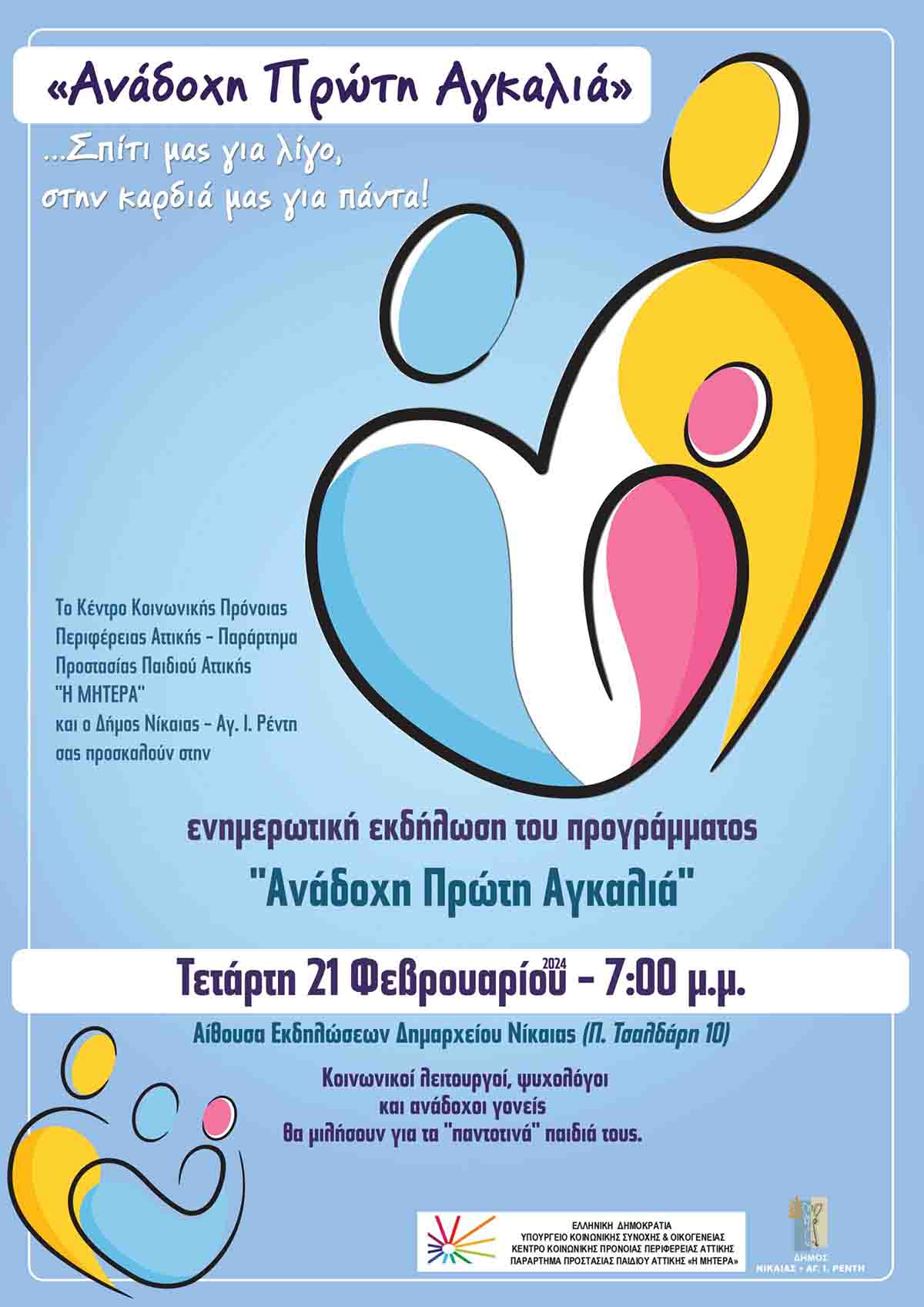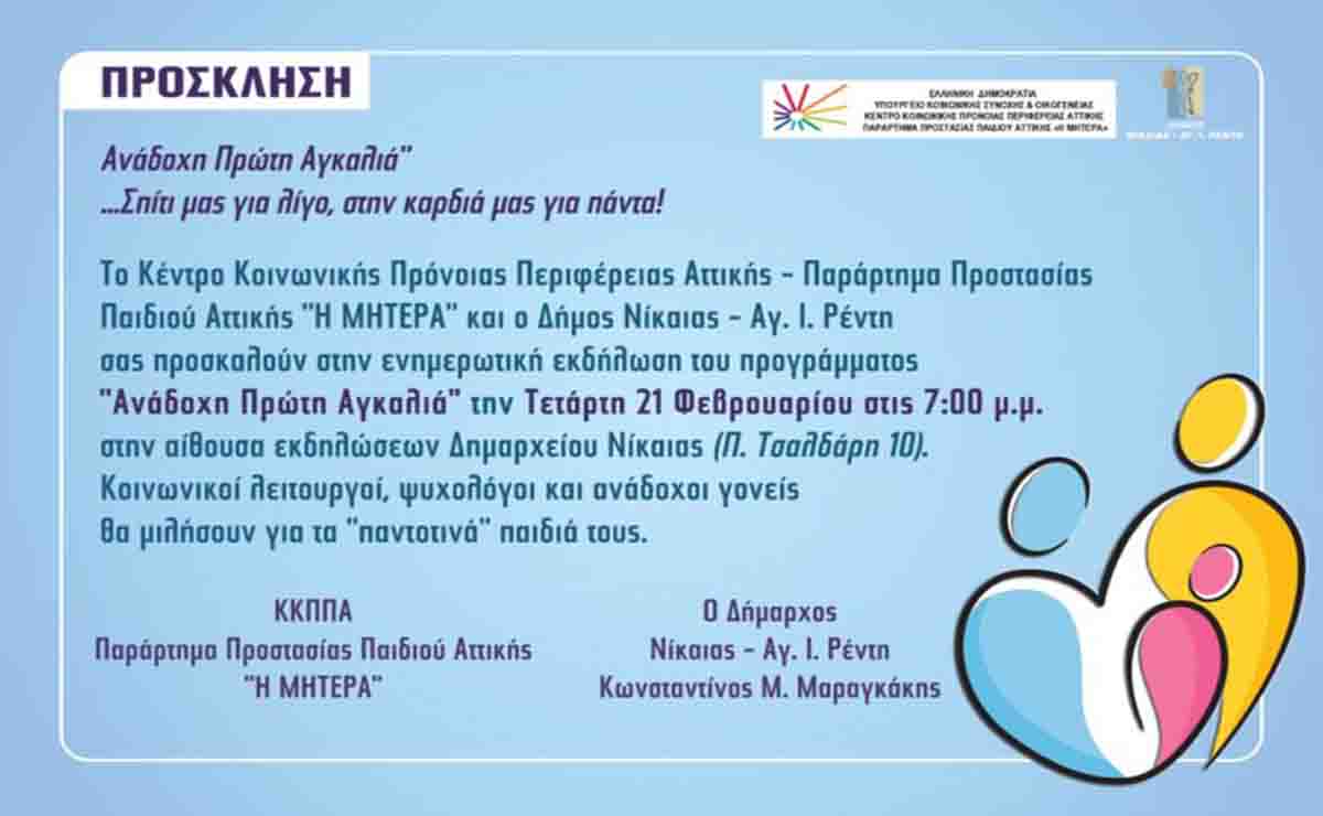 Ενημερωτική εκδήλωση του προγράμματος «Ανάδοχη Πρώτη Αγκαλιά»… Σπίτι μας για λίγο, στην καρδιά μας για πάντα! διοργανώνει το  Κέντρο Κοινωνικής Πρόνοιας Περιφέρειας Αττικής-Παράρτημα Προστασίας Παιδιού Αττικής «Η ΜΗΤΕΡΑ»  σε συνεργασία με τον Δήμο Νίκαιας-Αγ.Ι. Ρέντη. Η εκδήλωση θα πραγματοποιηθεί την Τετάρτη 21 Φεβρουαρίου στις 7.00 μ.μ. στην αίθουσα εκδηλώσεων Δημαρχείου Νίκαιας (Π. Τσαλδάρη 10).