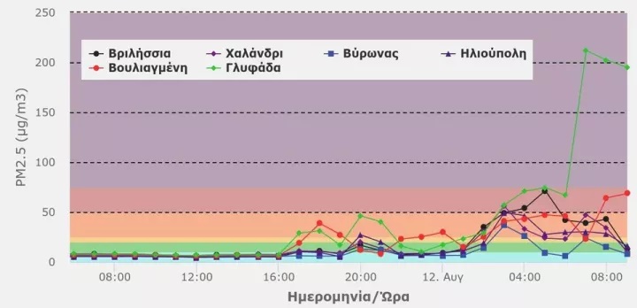 Σε συνέχεια της ολονύκτιας παρακολούθησης και ενημερώσεων του Εθνικού Αστεροσκοπείου Αθηνών για τις επικρατούσες συνθήκες και την ταχύτατη εξάπλωσης της πυρκαγιάς προς τα νότια υπό την επικράτηση ισχυρών βορείων ανέμων, η οποία από τα ξημερώματα της 12ης Αυγούστου προσέγγισε τις περιοχές Νέας και Παλαιάς Πεντέλης, η εικόνα των μέσων ωριαίων επιπέδων των αιωρούμενων σωματιδίων PM2.5, στην ατμόσφαιρα της Αττικής, μέχρι στιγμής, έχει ως ακολούθως:
