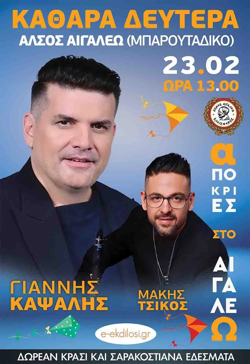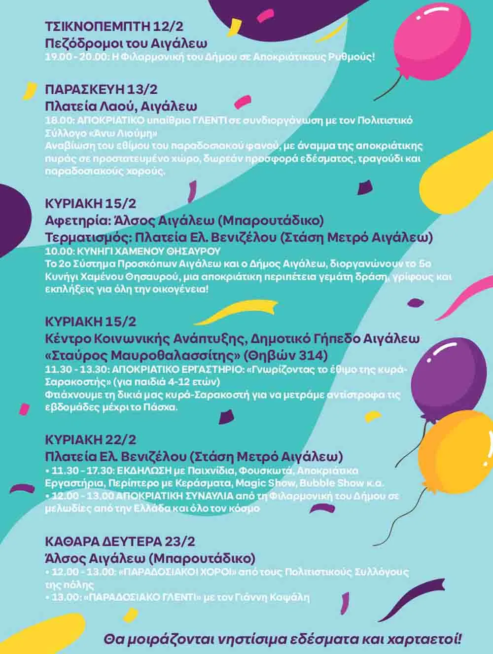 Ο Δήμος Αιγάλεω προσκαλεί σε μία γιορτή την πιο χαρούμενη εποχή του χρόνου! Με μία σειρά εκδηλώσεων που κορυφώνεται την Καθαρά Δευτέρα με τον Γιάννη Καψάλη…