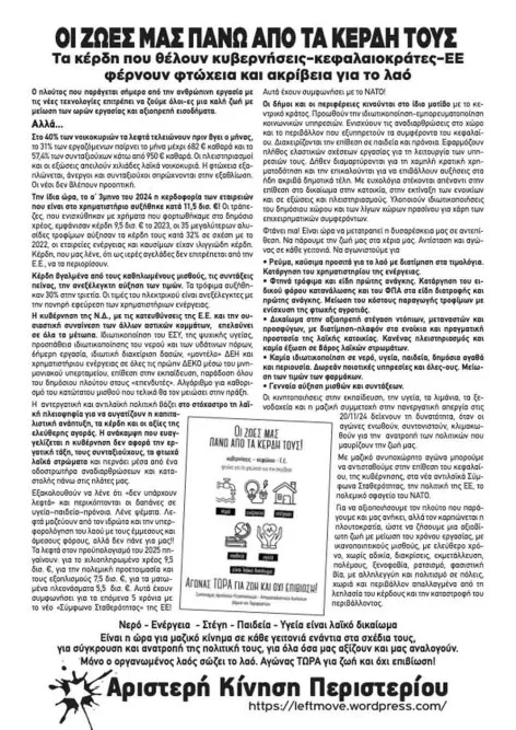 Το Σάββατο 25 Ιανουαρίου, μέλη της Αριστερής Κίνησης Περιστερίου πραγματοποίησαν εξορμήσεις έξω από το κατάστημα Σκλαβενίτη στη Λένορμαν και στην οδό Αιμιλίου Βεάκη, διανέμοντας προκηρύξεις κατά της ακρίβειας. Στόχος της δράσης ήταν να αναδειχθεί το ζήτημα της ραγδαίας αύξησης του κόστους ζωής, που πλήττει τη λαϊκή πλειοψηφία, ενώ ταυτόχρονα τα κέρδη μεγάλων εταιρειών και τραπεζών εκτοξεύονται.