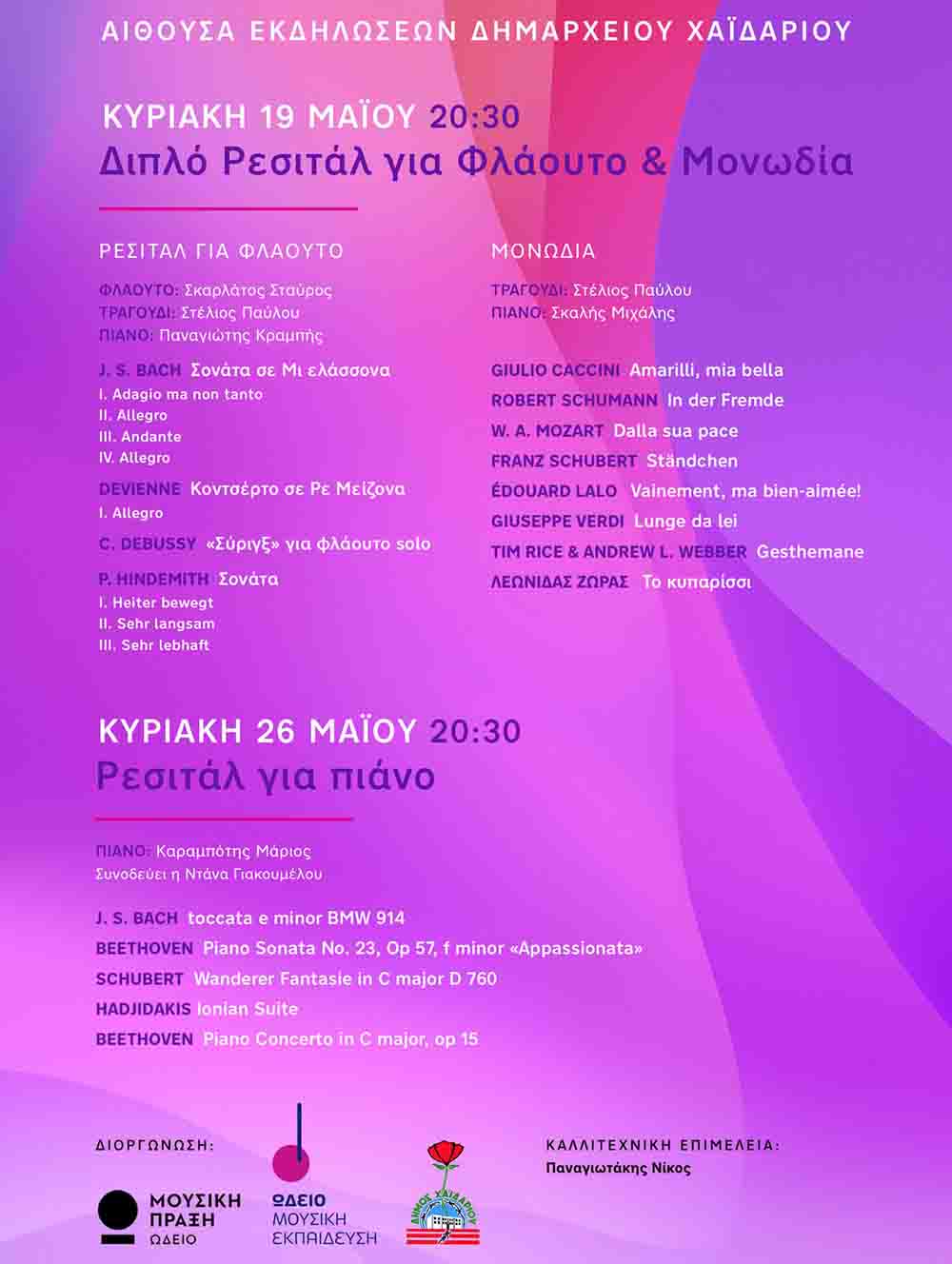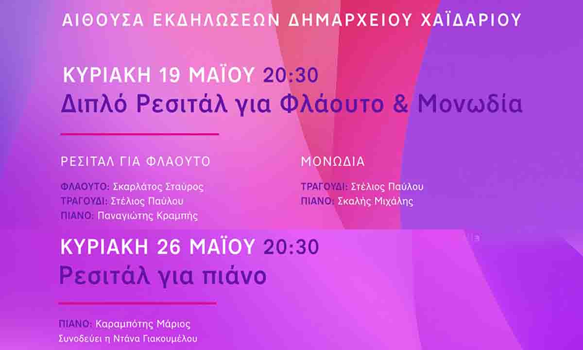 Ο Δήμος Χαϊδαρίου, με ανακοίνωσή του γνωστοποιεί στους δημότες του και ταυτόχρονα τους καλεί καλεί συναυλία φλάουτου και μονωδίας με συνοδεία πιάνου που θα πραγματοποιηθεί την Κυριακή 19 Μαΐου στις 20:30, στην Αίθουσα Εκδηλώσεων του Δημαρχείου και επίσης σε ρεσιτάλ πιάνου την Κυριακή 26 Μαΐου στις 20:30, στον ίδιο χώρο.