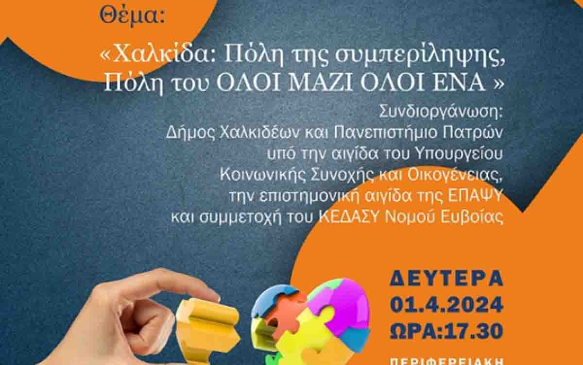 Επιστημονική ημερίδα με θέμα, «Χαλκίδα: Πόλη της συμπερίληψης, Πόλη του ΟΛΟΙ ΜΑΖΙ ΕΝΑ», διοργανώνει ο Δήμος Χαλκιδέων, σε συνεργασία με το Πανεπιστήμιο Πατρών και υπό την αιγίδα του Υπουργείου Κοινωνικής Συνοχής και Οικογένειας, την επιστημονική αιγίδα της Ε.Π.Α.Ψ.Υ και τη συμμετοχή του Κ.Ε.Δ.Α.Σ.Υ Εύβοιας.