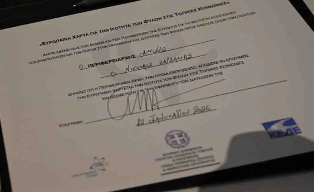 Ένα από τα πιο σημαντικά κανονιστικά κείμενα της Ευρωπαϊκής Ένωσης, η αναθεωρημένη έκδοση της Ευρωπαϊκής Χάρτας για την Ισότητα των Φύλων στις Τοπικές Κοινωνίες, υπεγράφη από τον Περιφερειάρχη Αττικής Νίκο Χαρδαλιά στο πλαίσιο ειδικής εκδήλωσης που διοργανώθηκε στο Ωδείο Αθηνών.