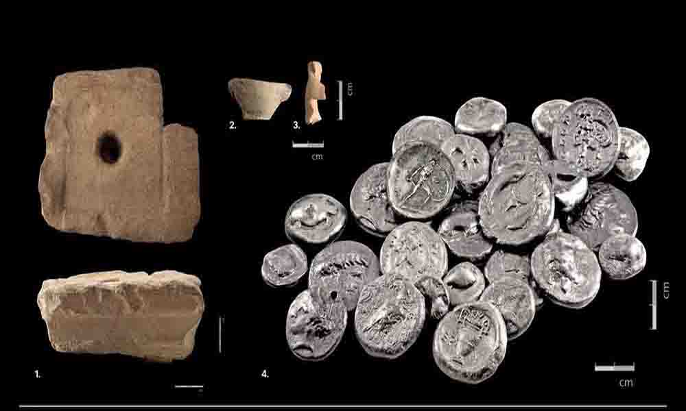 Επιπρόσθετα, αποκαλύφθηκε πλούσιο κτιριακό συγκρότημα των ύστερων αρχαϊκών χρόνων μέχρι τους ελληνιστικούς χρόνους, με επιμέρους χώρους λατρευτικής χρήσης μεταξύ αυτών και τριών εξαιρετικά επιμελημένων δεξαμενών, η μια εξ αυτών με κλίμακα καθόδου – ανόδου. Εξαιρετικής αρχαιολογικής σημασίας και σπανιότητας είναι ο θησαυρός 29 αργυρών αρχαίων ελληνικών νομισμάτων (εικ. 2) που εντοπίστηκε μαζί με φορητό πήλινο βωμό, μικρογραφικό αγγείο και ειδώλιο ίππου με αναβάτη. Ο θησαυρός περιλαμβάνει νομίσματα που χρονολογούνται από τον ύστερο 6ο αι. π.Χ. μέχρι και τη δεκαετία του 330 π.Χ., πολλά εξ αυτών από τα σπανιότερα και πλέον ιστορικά νομίσματα της αρχαίας Ελλάδας, όπως τρεις στατήρες Ήλιδος που κόπηκαν στην Ολυμπία κατά τη διάρκεια διαφορετικών Ολυμπιακών Αγώνων, στατήρα της Αίγινας με χερσαία αντί για θαλάσσια χελώνα, στατήρες Στύμφαλου, Άργους και Οπουντίων Λοκρών, καθώς στατήρα Θήβας του 5ου αι. π. Χ. που απεικονίζει τον Ηρακλή να πνίγει με τα χέρια του δύο φίδια.