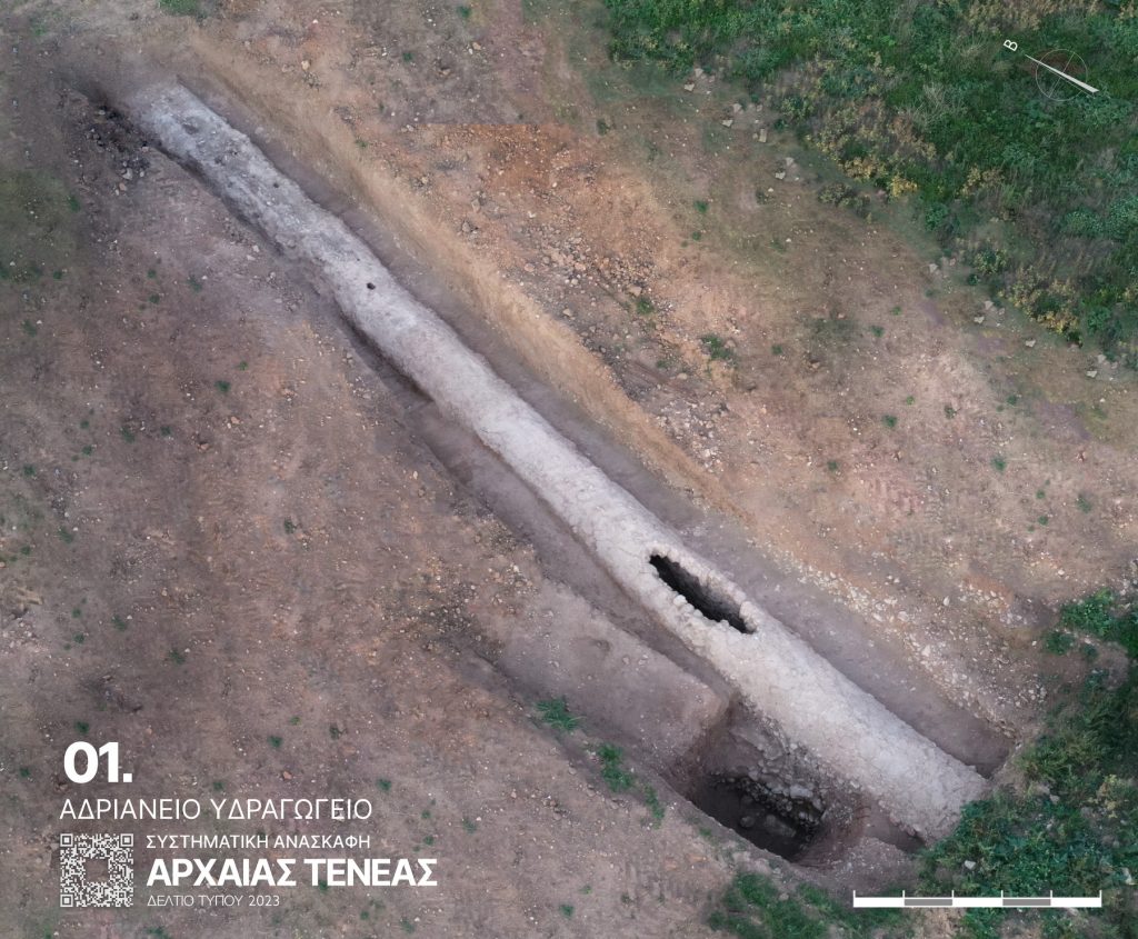 Η ανασκαφή, μεταξύ άλλων, αποκάλυψε για πρώτη φορά φέτος, τμήμα του Αδριάνειου υδραγωγείου στην περιοχή της αρχαίας Τενέας, προσδιορίζοντας επακριβώς πλέον την πορεία ενός από τα μεγαλύτερα υδραυλικά έργα του 2ου αι. μ.Χ. στον ελλαδικό χώρο, που σκοπό είχε την υδροδότηση της Αρχαίας Κορίνθου από τη Στυμφαλία (εικ. 1).