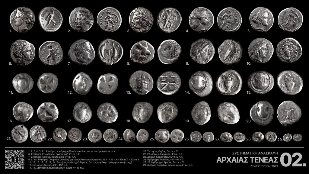 Γενικότερα, στο πρώιμο αυτό στρώμα της ανασκαφής παρατηρείται έντονη διασπορά αρχαίων ελληνικών χάλκινων νομισμάτων που προέρχονται κυρίως από τα νομισματοκοπεία της Κορίνθου, της Σικυώνας και του Άργους. Καλύπτουν χρονικά την περίοδο από τους ύστερους κλασικούς χρόνους (όπως ο χαλκούς Άργους του πρώτου μισού του 4ου αι. π. Χ. (εικ. 16.6)) μέχρι και τον 1ο αι π. Χ. που εκπροσωπείται από κοπές Σικυώνας που χρησιμοποιούνταν ευρέως στην Τενέα μετά την καταστροφή της Κορίνθου το 146 π. Χ.