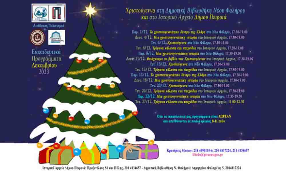 Το παράρτημα του Νέου Φαλήρου της Δημοτικής Βιβλιοθήκης Πειραιά και το Ιστορικό Αρχείο Δήμου Πειραιά καλωσορίζουν την περίοδο των Χριστουγέννων με μια σειρά εκπαιδευτικών προγραμμάτων γεμάτων από εκπλήξεις και παιχνίδια για τους μικρούς μας φίλους. Για όλο τον μήνα Δεκέμβριο κάθε Τετάρτη και Παρασκευή στο Νέο Φάληρο και κάθε Δευτέρα (εκτός από 25/12) και Τετάρτη στο Ιστορικό Αρχείο τα παιδιά θα έχουν την ευκαιρία να παίξουν, να διασκεδάσουν και να δημιουργήσουν σε μια γιορτινή ατμόσφαιρα μέσα από τις πλούσιες δραστηριότητες που έχει ετοιμάσει η μουσειοπαιδαγωγική μας ομάδα.