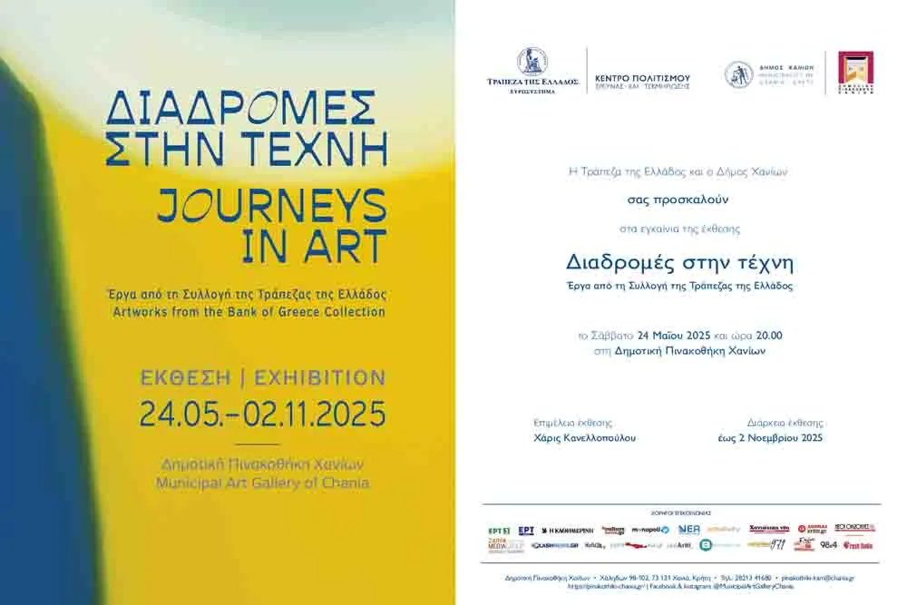 Η Δημοτική Πινακοθήκη Χανίων και το Κέντρο Πολιτισμού, Έρευνας και Τεκμηρίωσης της Τράπεζας της Ελλάδος παρουσιάζουν την έκθεση «Διαδρομές στην τέχνη. Έργα από τη Συλλογή της Τράπεζας της Ελλάδος». Διάρκεια της έκθεσης από τις 24 Μαΐου έως τις 2 Νοεμβρίου 2025.
