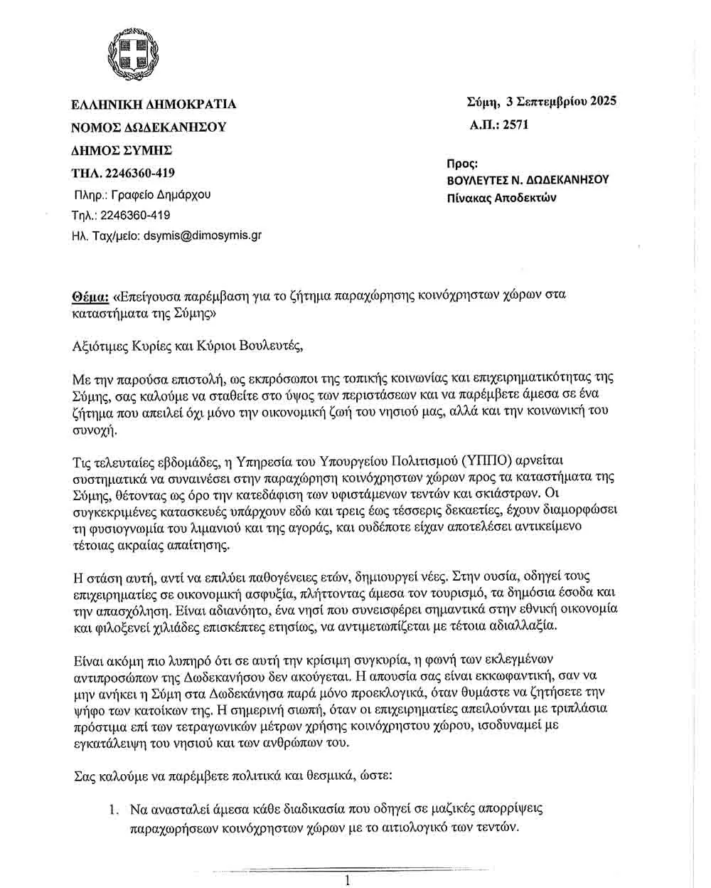Με επιστολή του, προς όλους τους Βουλευτές του Ν. Δωδεκανήσου, όπως αναφέρει χαρακτηριστικά, ο δήμαρχος Σύμης, κ. Λευτέρης Παπακαλοδούκας εκφράζει την έντονη δυσαρέσκειά του, αλλά και των επαγγελματιών του νησιού, για την άρνηση του Υπουργείου Πολιτισμού (ΥΠΠΟ) να συναινέσει στην παραχώρηση κοινόχρηστων χώρων στα καταστήματα του νησιού, θέτοντας ως όρο μάλιστα την κατεδάφιση των υφιστάμενων τεντών και σκιάστρων, που όπως  σημειώνει παραμένουν τοποθετημένες εδώ και 4 τουλάχιστον δεκαετίες. Αναφέρει δε στην επιστολή του, προς τους βουλευτές Δωδεκανήσου, ότι πρόκειται  για “ένα ζήτημα που απειλεί όχι μόνο την οικονομική ζωή του νησιού, αλλά και την κοινωνική του συνοχή”…