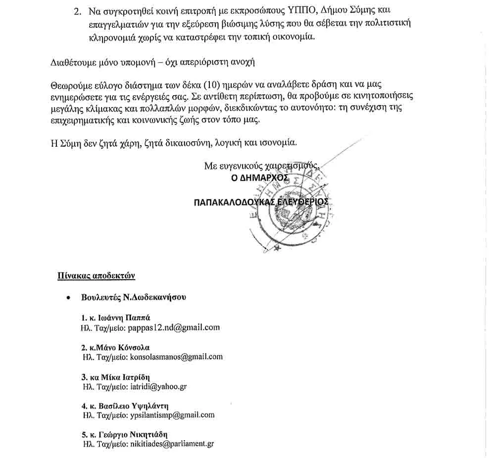 Δήμαρχος Σύμης προς Βουλευτές: “Δώστε λύση στην παραχώρηση κοινόχρηστων χώρων, αλλιώς κινητοποιήσεις μεγάλης κλίμακας ” (έγγραφο)