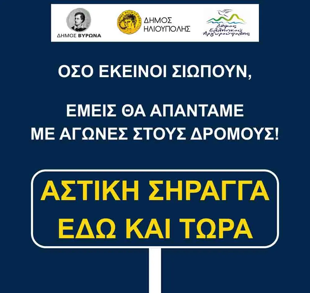 Οι Δήμοι Ηλιούπολης, Ελληνικού-Αργυρούπολης και Βύρωνα, μαζί με τα Δημοτικά Συμβούλια και τους πολίτες, βγαίνουμε δυναμικά μπροστά και στο άμεσο μέλλον θα ενταχθούν στην προσπάθεια αυτή και οι Δήμοι Δάφνης-Υμηττού και Αγίου Δημητρίου με στόχο να διευρύνουμε ακόμη περισσότερο το Μέτωπο των Δήμων απέναντι στην αδιαφορία.