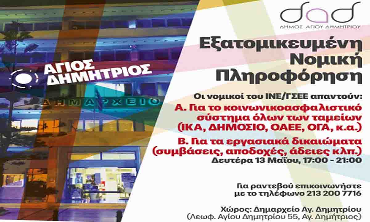 Η σχετική ενημέρωση των ενδιαφερομένων θα πραγματοποιηθεί τη Δευτέρα 13 Μαΐου 2024, από τις 17:00 έως τις 21:00, στο Δημαρχείο Αγίου Δημητρίου (Αγίου Δημητρίου 55).