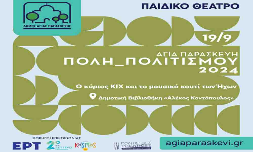 Ο Δήμος Αγίας Παρασκευής, με ανακοίνωσή τους, ενημερώνει  τους δημότες του, γονείς και μικρά παιδιά, ότι η παιδική παράσταση «Ο κύριος ΚΙΧ και το μουσικό κουτί των ήχων», που έχει προγραμματισθεί να πραγματοποιηθεί στον κήπο της Δημοτικής Βιβλιοθήκης «Αλέκος Κοντόπουλος», θα ξεκινήσει στις 19:30 της Πέμπτης 19 Σεπτεμβρίου, αντί  στις 21:00 που είχε αρχικά ανακοινωθεί…