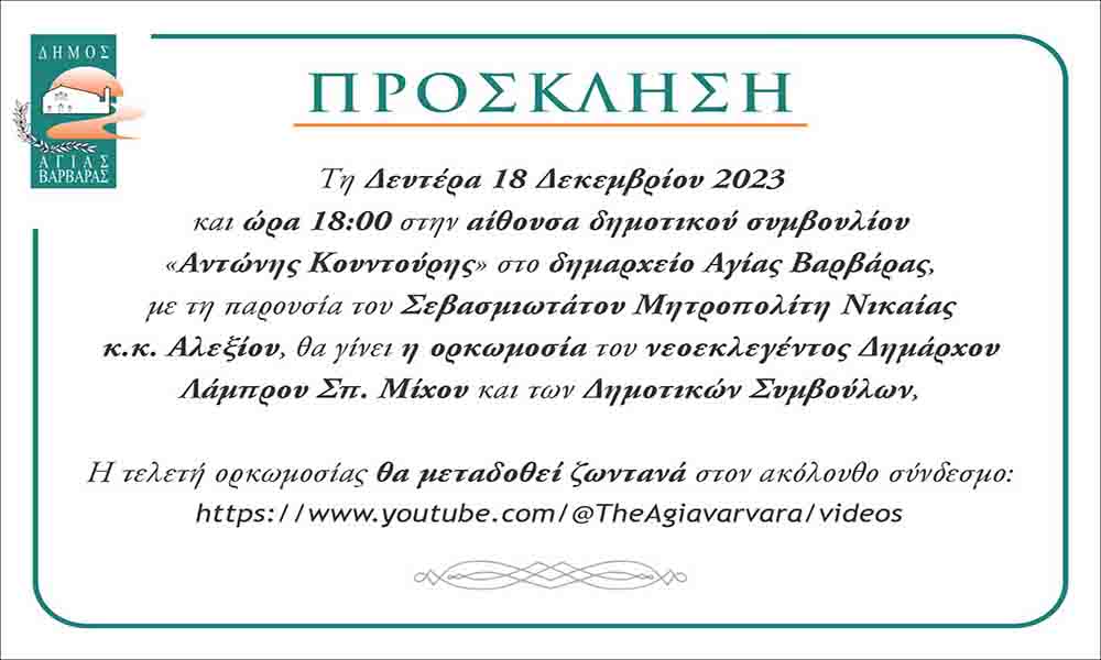 Δήμος Αγίας Βαρβάρας: Δευτέρα 18 Δεκεμβρίου η ορκωμοσία της Νέας, για την περίοδο 2024-28, Δημοτικής Αρχής (έγγραφο)