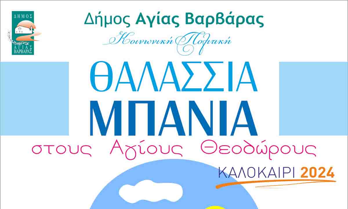 Ο Δήμος Αγίας Βαρβάρας, με ανακοίνωσή του ενημερώνει  τους πολίτες και τους δημότες του ότι ο δήμος έχει προγραμματίσει θαλάσσια μπάνια στους Αγίους Θεοδώρους, για τον μήνα Αύγουστο και ειδικότερα τις ημερομηνίες: 5, 7, 9, 12, 19, 21 και 23 Αυγούστου. Τα Λεωφορεία θα ξεκινούν από τρία σημεία, Προφήτη Ηλία (επί της Παπαδιαμάντη), Στέγη Ποντίων (Μεγάλου Αλεξάνδρου 169) και Πλατεία Μοκρυγιάννη (Ηρακλείου 20) στις 8:15 το πρωί. Στις 12:30 το μεσημέρι αναχωρούν από τους Αγίους Θεοδώρους.