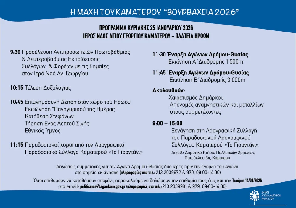 Ο Δήμος Αγίων Αναργύρων-Καματερού ενημερώνει ότι οι εκδηλώσεις για τη Μάχη του Καματερού, τα αποκαλούμενα Βουρβάχεια θα πραγματοποιηθούν την Κυριακή 25 Ιανουαρίου στο Καματερό με ώρα έναρξης τις 09.30 π.μ. στον Άγιο Γεώργιο Καματερού και στη συνέχεια με επιμνημόσυνη δέηση και κατάθεση στεφάνων στο Ηρώον.