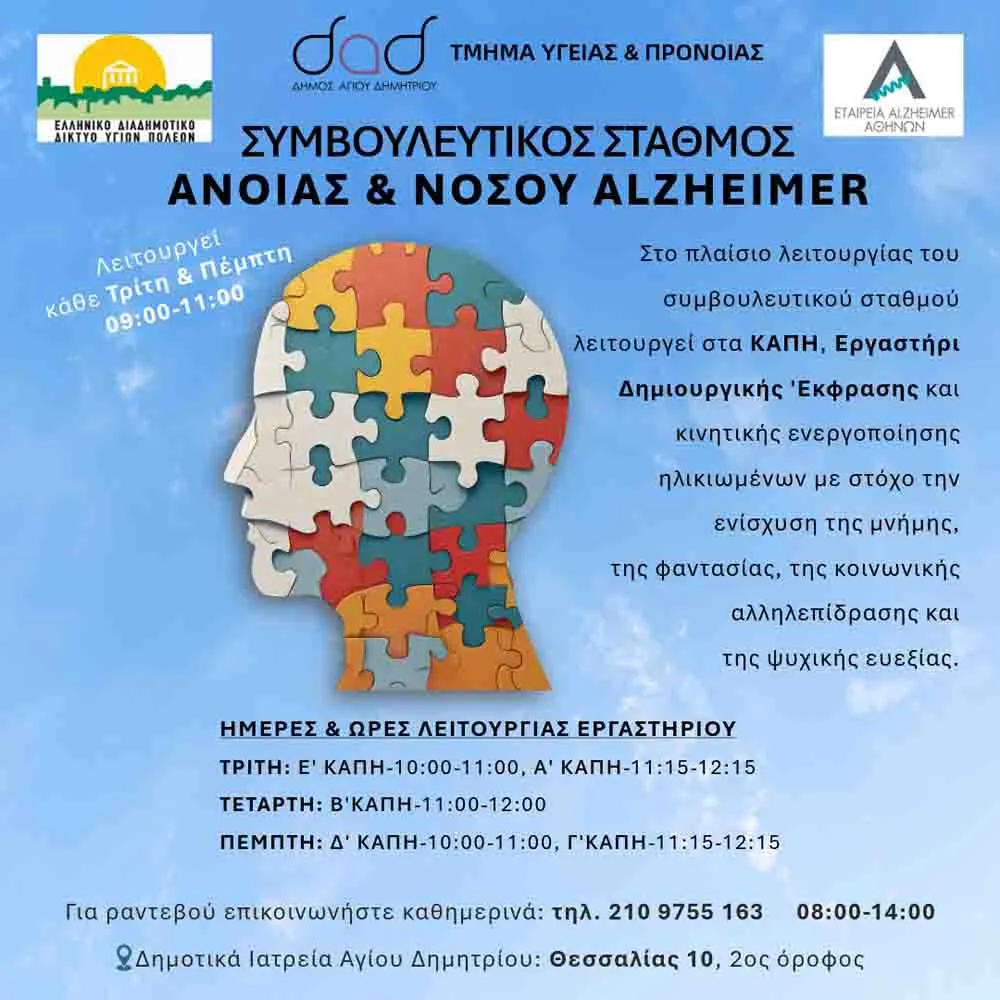 Στο πλαίσιο λειτουργίας του Συμβουλευτικού Σταθμού Άνοιας και της νόσου Alzheimer του Δήμου Αγίου Δημητρίου, λειτουργεί πλέον στα ΚΑΠΗ, Εργαστήρι Δημιουργικής ‘Έκφρασης και κινητικής ενεργοποίησης ηλικιωμένων με στόχο την ενίσχυση της μνήμης, της φαντασίας, της κοινωνικής αλληλεπίδρασης και της ψυχικής ευεξίας.