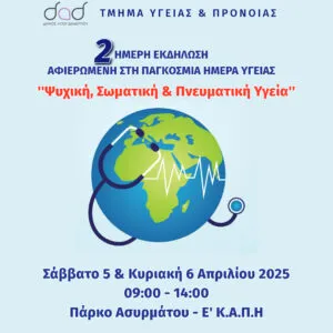 Το Τμήμα Υγείας και Πρόνοιας του Δήμου Αγίου Δημητρίου, με αφορμή την Παγκόσμια Ημέρα Υγείας (7 Απριλίου) οργανώνει διήμερη δράση, το Σάββατο 5 και την Κυριακή 6 Απριλίου 2025 και ώρες 9 π.μ. – 2 μ.μ., στο Ε΄ΚΑΠΗ (Πάρκο Ασύρματου) με δωρεάν εξετάσεις σωματικής και ψυχικής υγείας, δράσεις ενημέρωσης και ποικίλες άλλες εκδηλώσεις υπό τον γενικό τίτλο “Ψυχική, Σωματική και Πνευματική υγεία”.