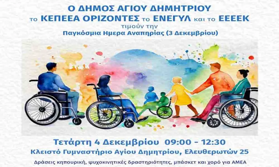 Εκδήλωση ευαισθητοποίησης για τα δικαιώματα, το σεβασμό και την ευημερία των Ατόμων με Αναπηρία, διοργανώνει ο Δήμος Αγίου Δημητρίου σε συνεργασία με το ΚΕΠΕΕΑ ΟΡΙΖΟΝΤΕΣ και τα εκπαιδευτικά ιδρύματα ΕΝΕΓΥΛ και ΕΕΕΕΚ, με αφορμή την Παγκόσμια Ημέρα Ατόμων με Αναπηρία, (3 Δεκεμβρίου).