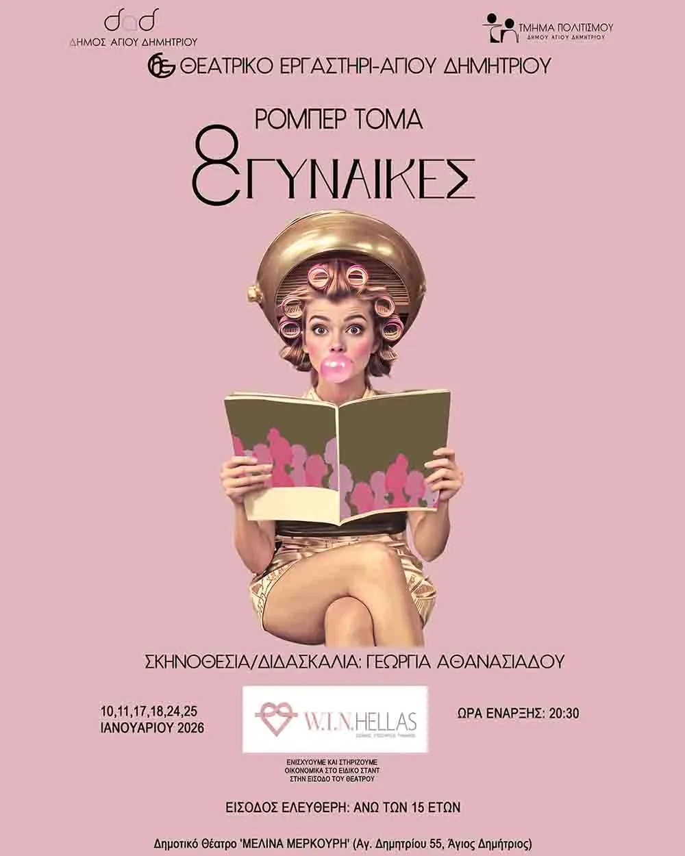 Το Θεατρικό Εργαστήρι του Δήμου Αγίου Δημητρίου παρουσιάζει τη νέα του θεατρική παραγωγή με τίτλο «8 Γυναίκες» του Ρομπέρ Τομά, μια παράσταση με έντονα στοιχεία αστυνομικού μυστηρίου, φάρσας και σάτιρας. Τη σκηνοθεσία και διδασκαλία υπογράφει η Γεωργία Αθανασιάδου.