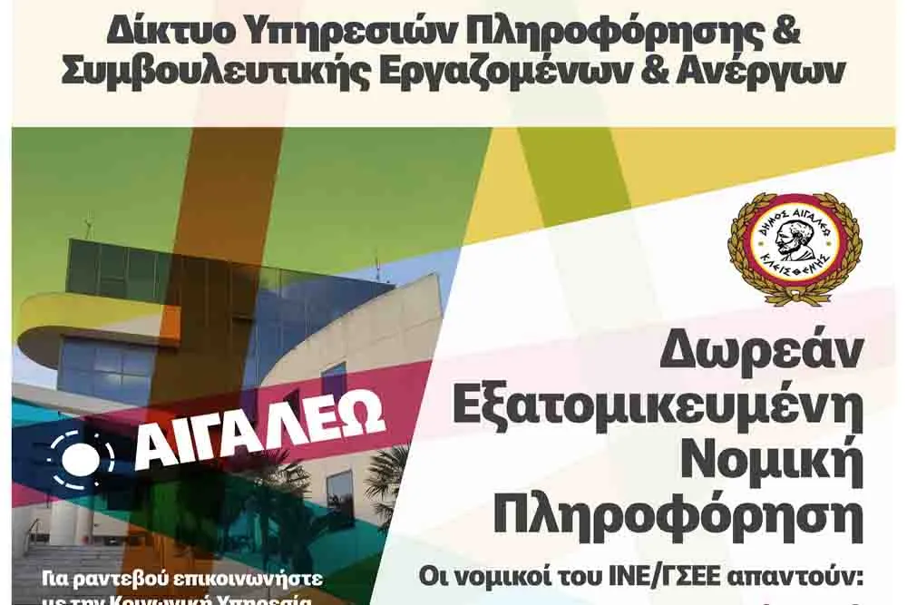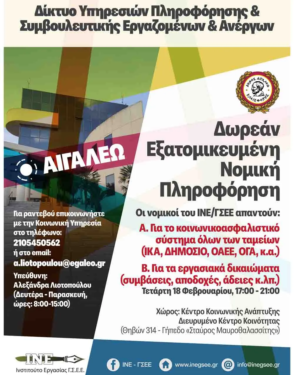 Στο πλαίσιο αυτό, ο Δήμος Αιγάλεω, σε συνεργασία με το Ινστιτούτο Εργασίας της ΓΣΕΕ (ΙΝΕ – ΓΣΕΕ), προχωρά στη διοργάνωση νέας συνάντησης, προσφέροντας σε εργαζόμενους, ανέργους και συνταξιούχους τη δυνατότητα δωρεάν πρόσβασης σε έγκυρη και εξειδικευμένη νομική υποστήριξη.