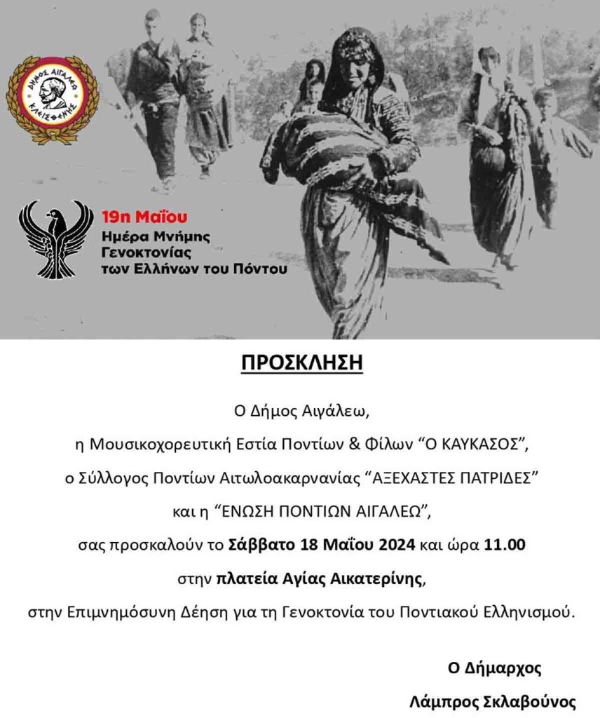Ο Δήμος Αιγάλεω τιμά την Ημέρα Μνήμης της Γενοκτονίας του Ποντιακού Ελληνισμού και σε συνεργασία με τη Μουσικοχορευτική Εστία Ποντίων και Φίλων “Ο ΚΑΥΚΑΣΟΣ”, τον Σύλλογο Ποντίων Αιτωλοακαρνανίας “ΑΞΕΧΑΣΤΕΣ ΠΑΤΡΙΔΕΣ” και την “ΕΝΩΣΗ ΠΟΝΤΙΩΝ ΑΙΓΑΛΕΩ”, καλεί τους δημότες να παραστούν στην Επιμνημόσυνη Δέηση που θα πραγματοποιηθεί για τα 105 χρόνια από τη Γενοκτονία του Ποντιακού Ελληνισμού, το Σάββατο 18 Μαΐου 2024 και ώρα 11 π.μ. στην πλατεία Αγίας Αικατερίνης.