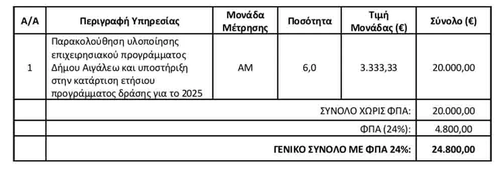 Σύμφωνα με απόφαση δημοσιευμένη στο Διαύγεια του Δήμου Αιγάλεω, ο Δήμαρχος της Πόλης κ. Λάμπρος Σκλαβούνος, με απόφασή του στις 29 Δεκεμβρίου 2025, με «Απευθείας Ανάθεση» σε ιδιωτικό φορέα συμβουλευτικών υπηρεσιών, αναθέτει την εκτέλεση της υπηρεσίας: «Παρακολούθηση υλοποίησης επιχειρησιακού προγράμματος Δήμου Αιγάλεω και υποστήριξη στην κατάρτιση ετήσιου προγράμματος δράσης για το 2026», της Δ/νσης Προγραμματισμού, Ανάπτυξης & Διαφάνειας, στην εταιρεία: ‘’…. CONSULTING ΙΔΙΩΤΙΚΗ ΚΕΦΑΛΑΙΟΥΧΙΚΗ ΕΤΑΙΡΕΙΑ’’ – ΠΑΡΟΧΗ ΕΠΙΧΕΙΡΗΜΑΤΙΚΩΝ ΣΥΜΒΟΥΛΩΝ, συνολικής αξίας 24.800,00 ευρώ με Φ.Π.Α 24%