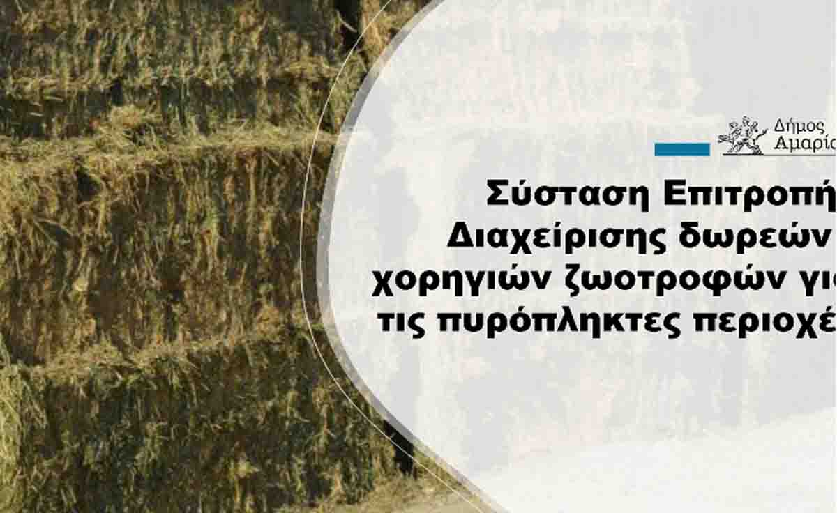 Ο δήμος Αμαρίου, σε συνεργασία με τον Κτηνοτροφικό Σύλλογο, λαμβάνοντας υπόψη τις πρόσφατες πυρκαγιές και τις επιπτώσεις τους στον τομέα της κτηνοτροφίας, προχωρά στη σύσταση επιτροπής Διαχείρισης Δωρεών και Χορηγιών Ζωοτροφών για την υποστήριξη των πυρόπληκτων περιοχών.