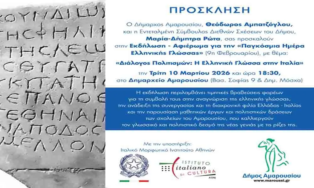 Ο Δήμαρχος Αμαρουσίου, Θεόδωρος Αμπατζόγλου, και η Εντεταλμένη Σύμβουλος Διεθνών Σχέσεων, Μαρία-Δήμητρα Ρώτα, σας προσκαλούν στην Εκδήλωση – Αφιέρωμα για την ‘’Παγκόσμια Ημέρα Ελληνικής Γλώσσας’’ (9η Φεβρουαρίου), με θέμα: «Διάλογος Πολιτισμών: Η Ελληνική Γλώσσα στην Ιταλία», την Τρίτη 10 Μαρτίου 2026 και ώρα 18:30, στο Δημαρχείο Αμαρουσίου (Βασ. Σοφίας 9 & Δημ. Μόσχα).