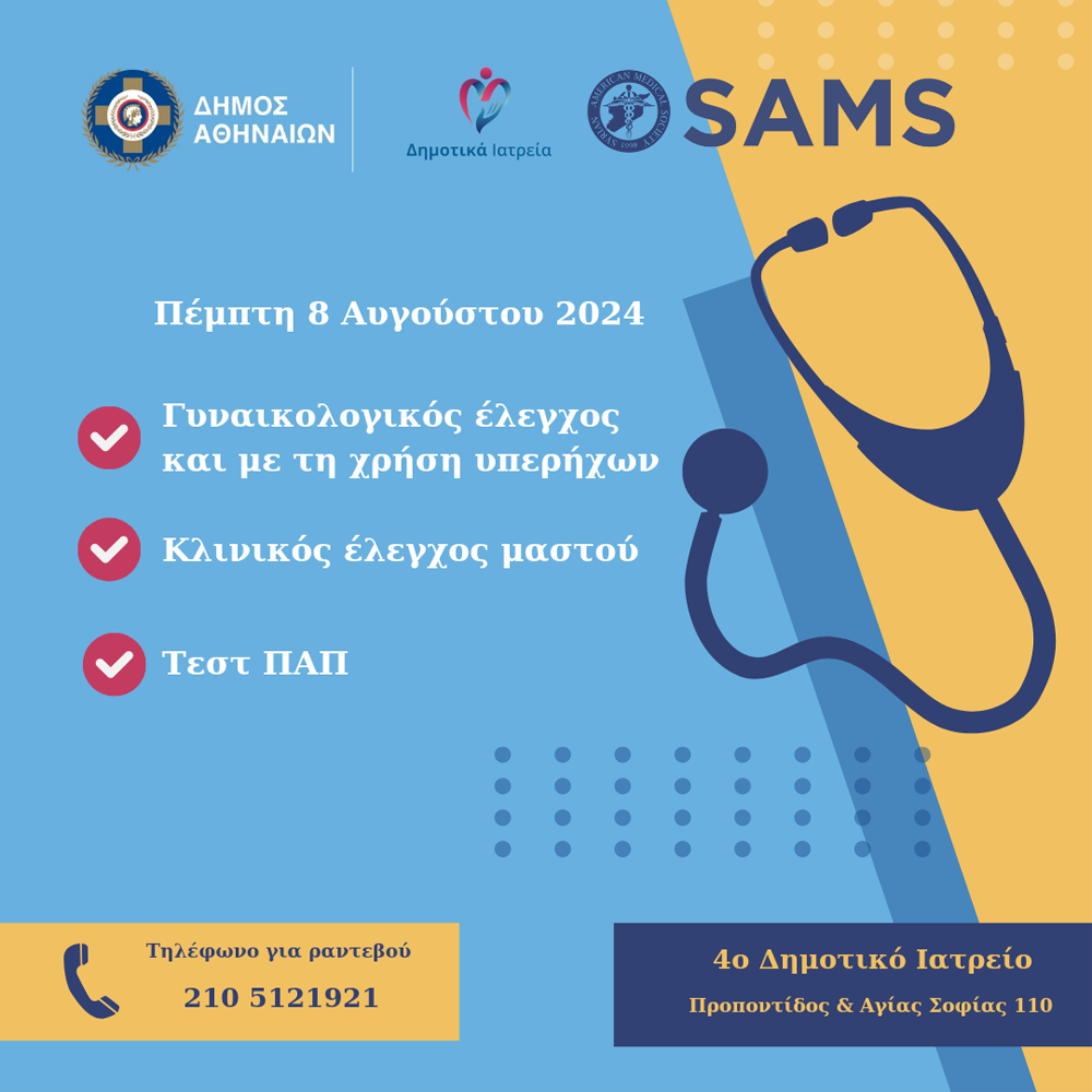 Με σκοπό την ενίσχυση της γυναικείας υγείας, το Τμήμα Προληπτικής Αγωγής, Προαγωγής Υγείας και Δημόσιας Υγείας του Δήμου Αθηναίων συνεργάζεται με την Ιατρική Οργάνωση SAMS Ελλάς, παρέχοντας δωρεάν γυναικολογικό έλεγχο.