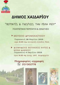 Ο Δήμος Χαϊδαρίου στο πλαίσιο των δράσεων για τα Κέντρα Φιλίας Ηλικιωμένων (πρώην ΚΑΠΗ), διοργανώνει μια σειρά πολιτιστικών, φυσιολατρικών περιπάτων με στόχο την επαφή και τη γνωριμία με την πόλη.