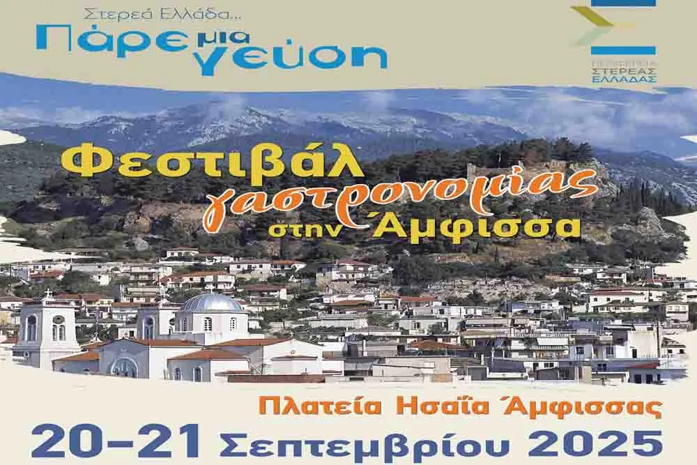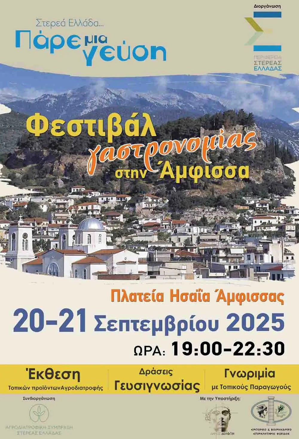 Η Περιφέρεια Στερεάς Ελλάδας, σε συνεργασία με την Αγροδιατροφική Σύμπραξη Στερεάς Ελλάδας και την υποστήριξη του Δήμου Δελφών και του Επιμελητηρίου Φωκίδος, διοργανώνει στις το Σάββατο 20 και την Κυριακή 21 Σεπτεμβρίου 2025, στην πλατεία Ησαΐα στην Άμφισσα, το Φεστιβάλ Γαστρονομίας «Στερεά Ελλάδα – Πάρε μια Γεύση».