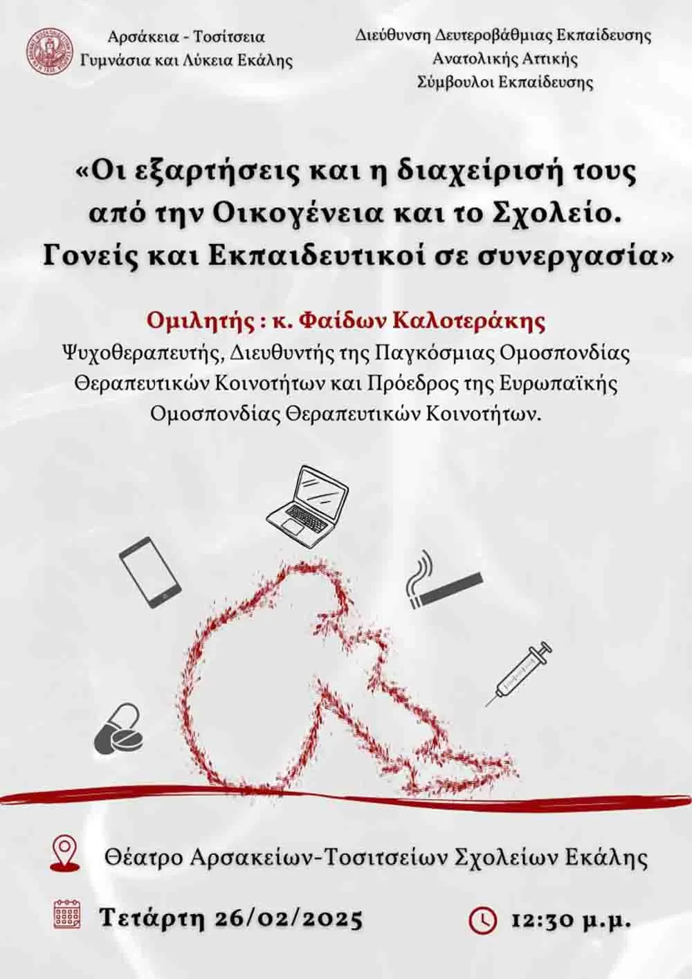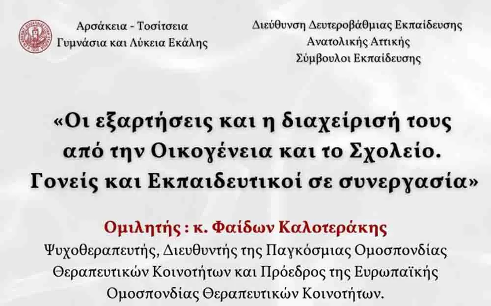 Διοργανώνεται την Τετάρτη 26 Φεβρουαρίου 2025, από τις 12:30 έως τις 14:15 μ.μ., στο Θέατρο των Αρσακείων-Τοσιτσείων Σχολείων Εκάλης η επιμορφωτική δράση με τίτλο: «Οι εξαρτήσεις και η διαχείρισή τους από την Οικογένεια και το Σχολείο. Γονείς και Εκπαιδευτικοί σε συνεργασία»…