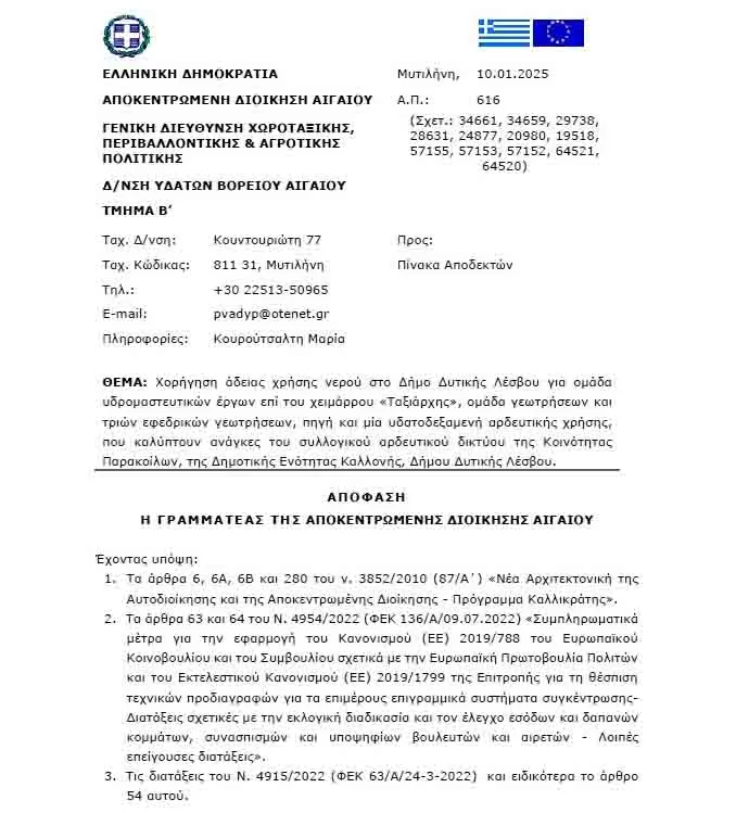 Ο Δήμαρχος Ταξιάρχης Βέρρος καθώς και η αρμόδια αντιδήμαρχος Ασανούλα Γιαννή-Κοκκινέλλη, συγχαίρουν το προσωπικό της Διεύθυνσης Περιβάλλοντος που εξασφάλισαν για τον Δήμο Δυτικής Λέσβου αυτή την ιδιαίτερα σύνθετη αδειοδότηση – από τις μεγαλύτερες που έχει εκδώσει η Διεύθυνση Υδάτων Βορείου Αιγαίου. Ενώ ευχαριστούν θερμά τον Διευθυντή και το προσωπικό της Διεύθυνσης Υδάτων Βορείου Αιγαίου της Αποκεντρωμένης Διοίκησης Αιγαίου καθώς και το προσωπικό του Τμήματος Υδροοικονομίας της Περιφέρειας Βορείου Αιγαίου, για την συνεργασία σε όλα τα στάδια της αδειοδότησης.