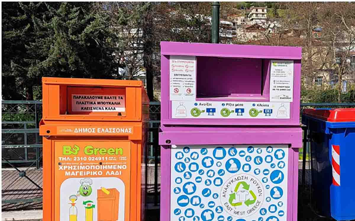 Οι κάδοι τοποθετήθηκαν σε κεντρικά σημεία στην πόλη της Ελασσόνας και στην Τσαριτσάνη, δίπλα στους μωβ κάδους, σε συνεργασία με την εταιρία EAST-WEST GREECE η οποία έχει αναλάβει και την συλλογή χρησιμοποιημένων ρούχων στον Δήμο.