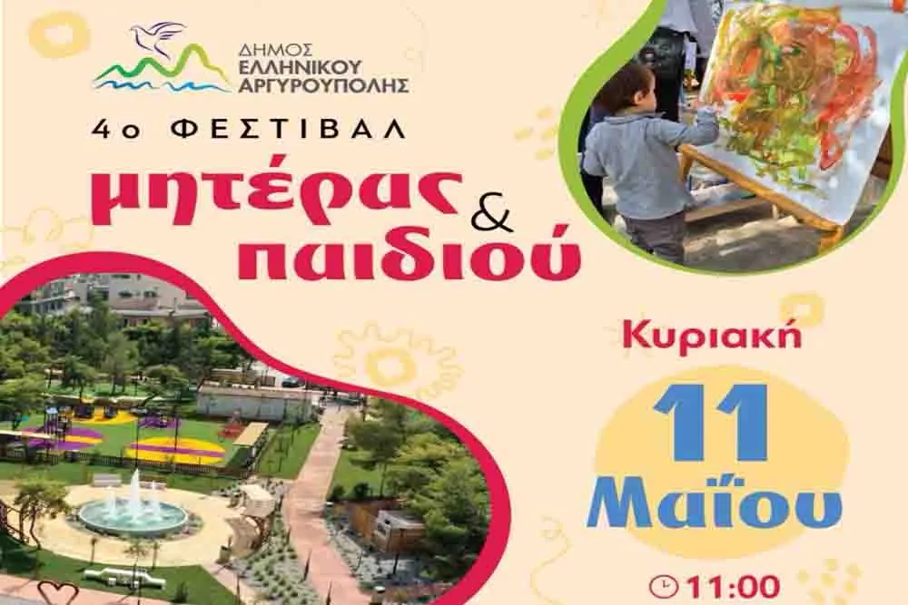 Ο Δήμος Ελληνικού – Αργυρούπολης και το Τμήμα Προσχολικής Αγωγής, τιμώντας την Γιορτή της Μητέρας, προσκαλεί μικρούς και μεγάλους στο «4ο Φεστιβάλ Μητέρας – Παιδιού», την Κυριακή 11 Μαΐου στις 11:00 π.μ., στο Πάρκο Αφροδίτης (στη συμβολή της Λ. Κύπρου και της οδού Αφροδίτης, στο Ελληνικό).