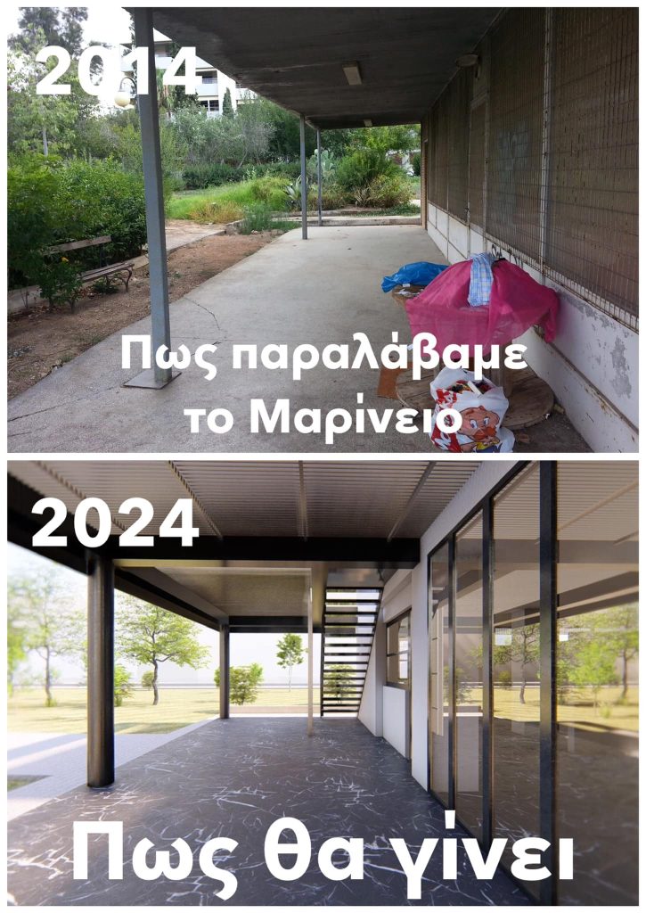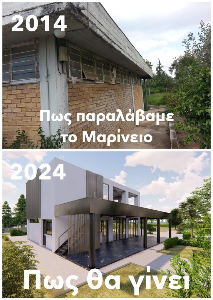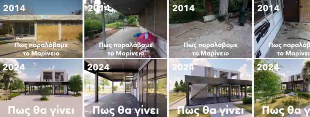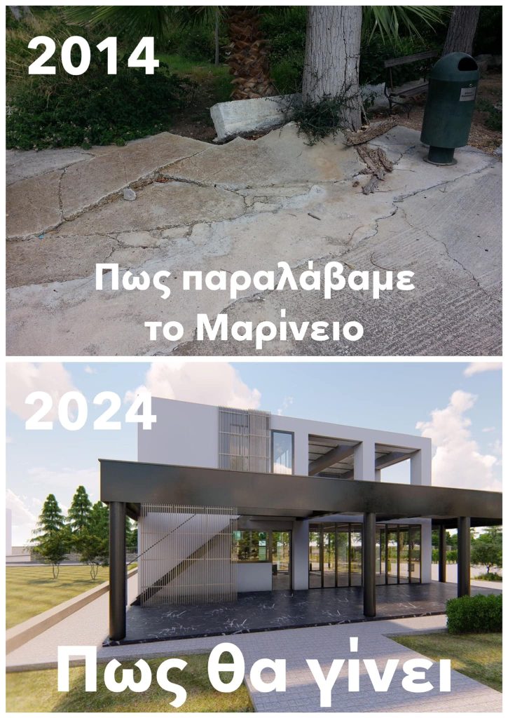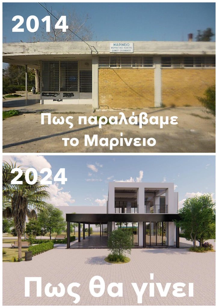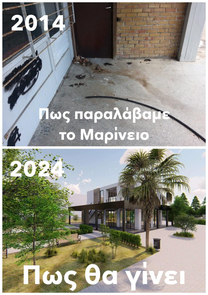 - Όταν, το 2014, αναλάβαμε τη Διοίκηση του Δήμου, μεταξύ όλων των άλλων σαθρών, εγκαταλελειμμένων και παρακμιακών εγκαταστάσεων που κληρονομήσαμε, ήταν και το κτίριο του Μαρινείου. Είχε γίνει ένας χώρος που συγκέντρωνε περιθωριακά στοιχεία και το φωτογραφικό υλικό εκείνης της εποχής αποδεικνύει του λόγου το αληθές.