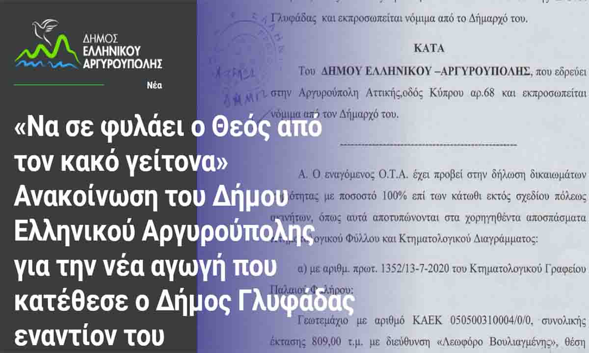«Να σε φυλάει ο Θεός από τον κακό γείτονα» Ανακοίνωση του Δήμου Ελληνικού Αργυρούπολης για την νέα αγωγή που κατέθεσε ο Δήμος Γλυφάδας εναντίον του