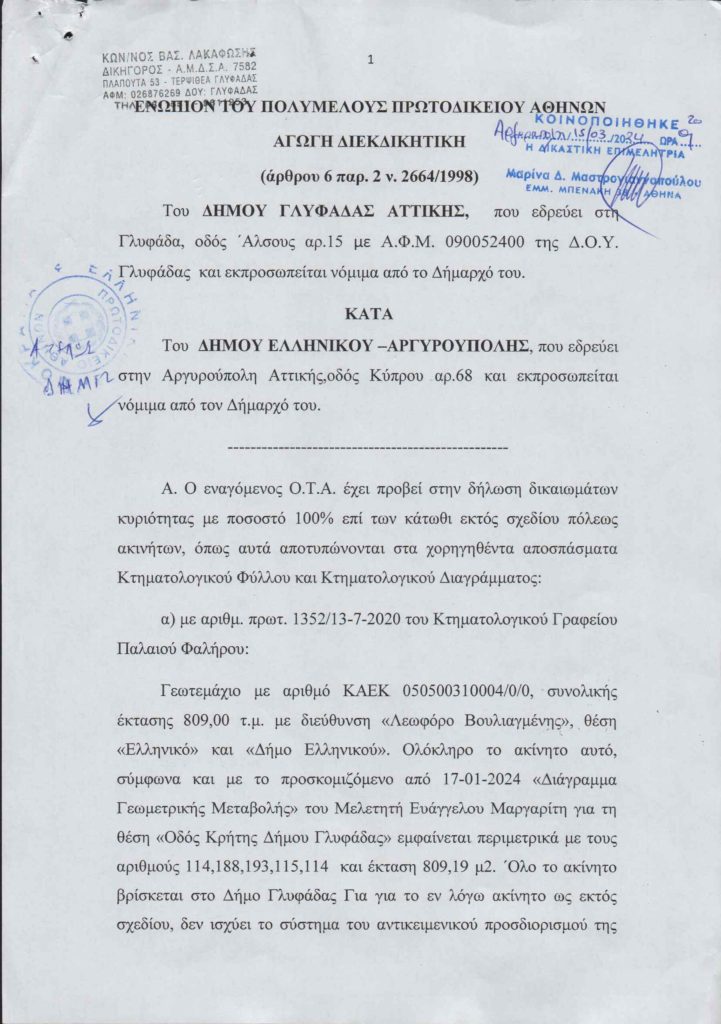 Με την ιστορία να επαναλαμβάνεται, για μια ακόμη φορά, ο Δήμος Γλυφάδας απέστειλε νέα αγωγή «διεκδικητική» εναντίον του Δήμου Ελληνικού Αργυρούπολης, όπως φαίνεται και στη σχετική φωτογραφία. Βάσει της αγωγής, διεκδικεί και πάλι εκτάσεις μέσα στα Σούρμενα και επιδιώκει την αυθαίρετη αλλαγή των ορίων του Δήμου μας, μετά από 80 χρόνια γειτνίασης!