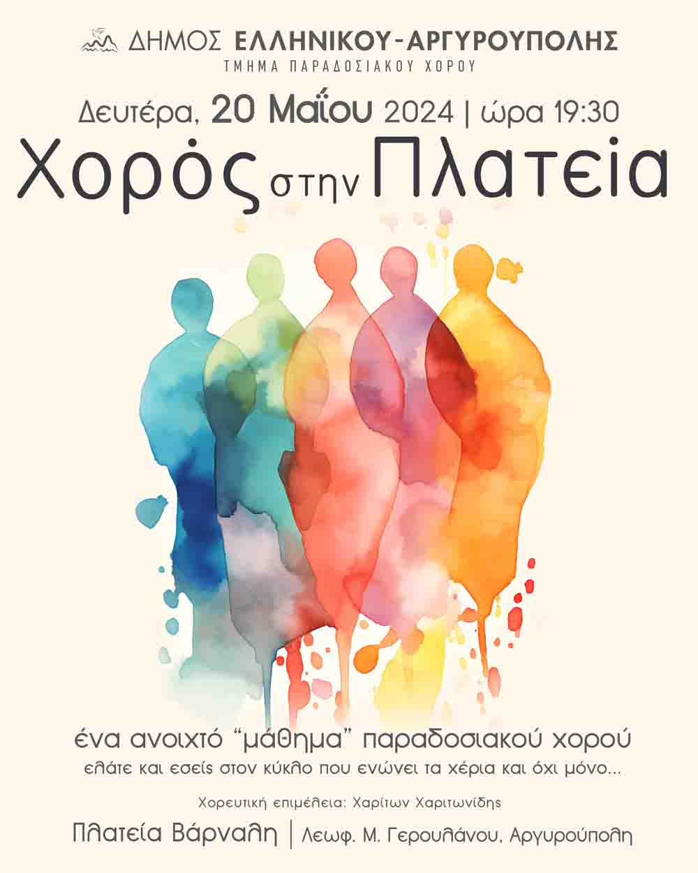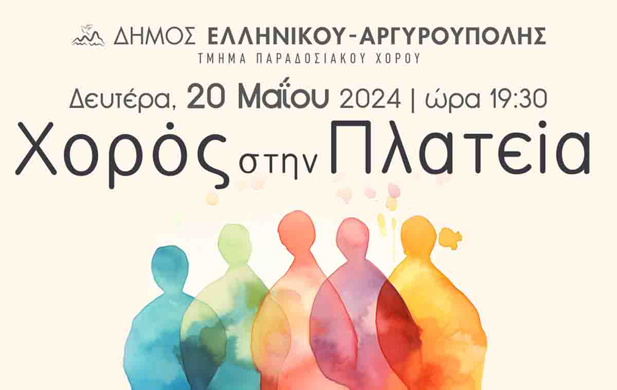 Ο Δήμος Ελληνικού-Αργυρούπολης και το Τμήμα Παραδοσιακού Χορού, σας προσκαλούν τη Δευτέρα, 20 Μαΐου 2024 και ώρα 19:30, σε ένα ανοιχτό προς όλους «μάθημα χορού» στην Πλατεία Βάρναλη (Λεωφ. Μαρίνου Γερουλάνου, Αργυρούπολη).